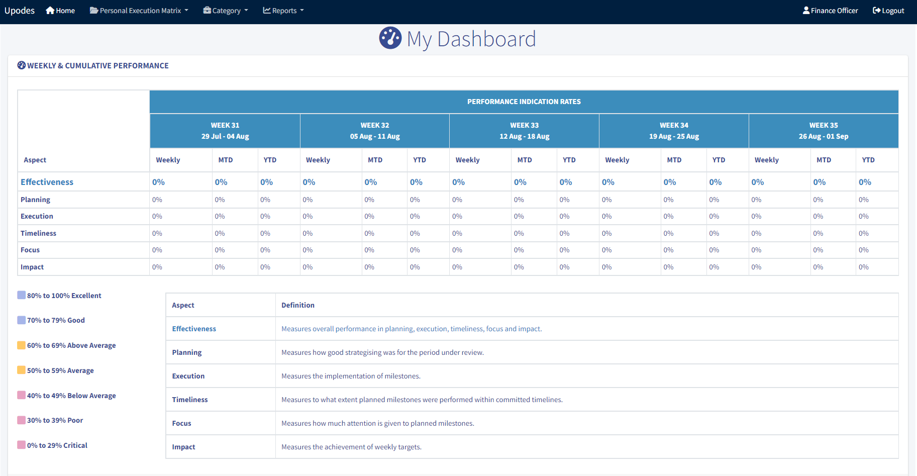 The system provides dashboard indications of Impact, Execution, Efficiency and Focus. These indicators make it easy for management to timely identify and address any shortcomings at individual and team levels for better performance.